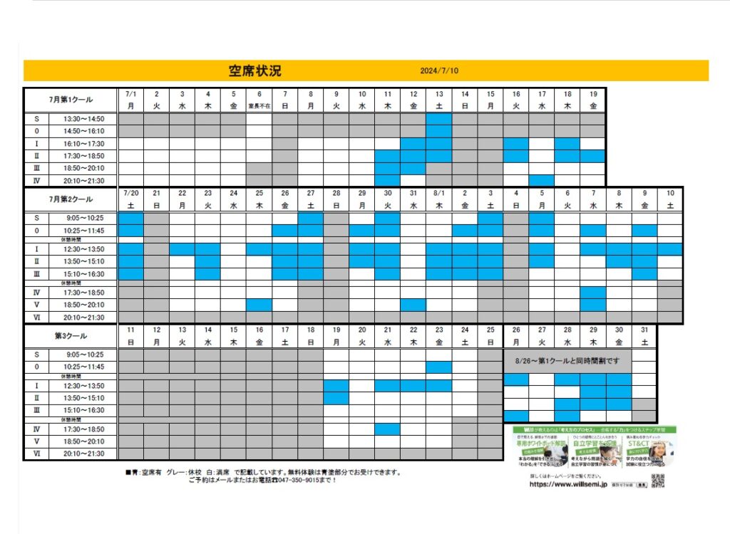 個別ゼミwill新浦安高洲校・2024夏期講習の新規受付についてのご案内です。